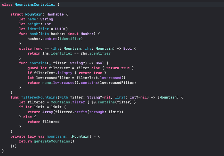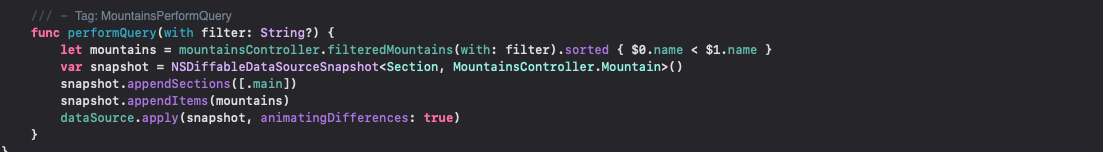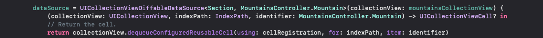 Section은 말그대로 섹션이고 MountainsController.Mountain은 산의 이름이 포함된 셀에 뿌릴 데이터들입니다.